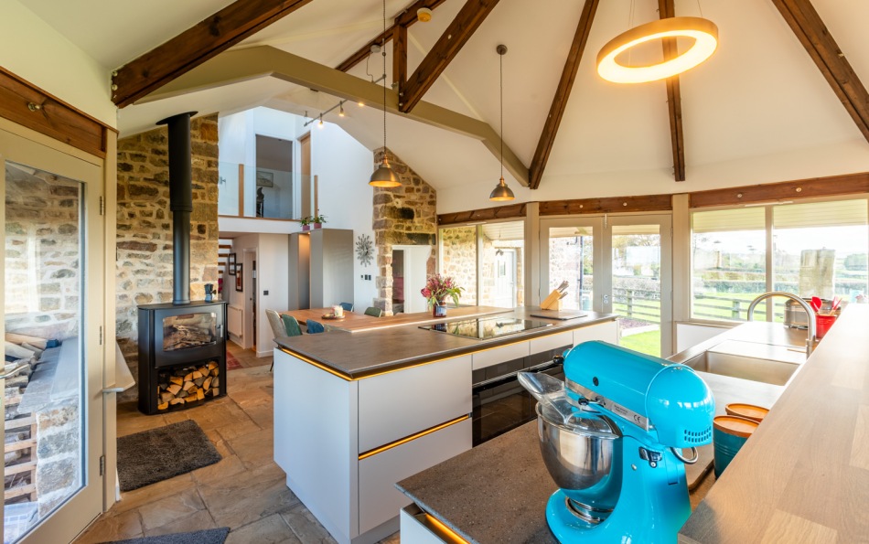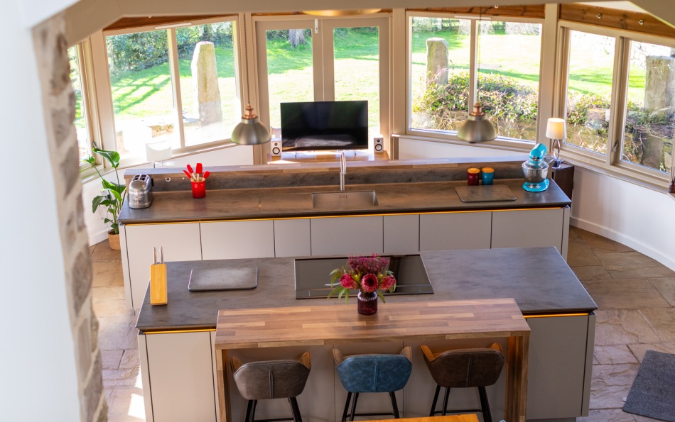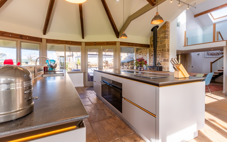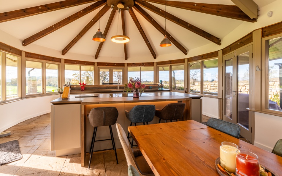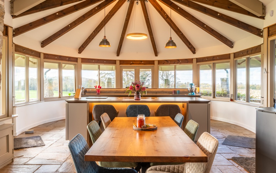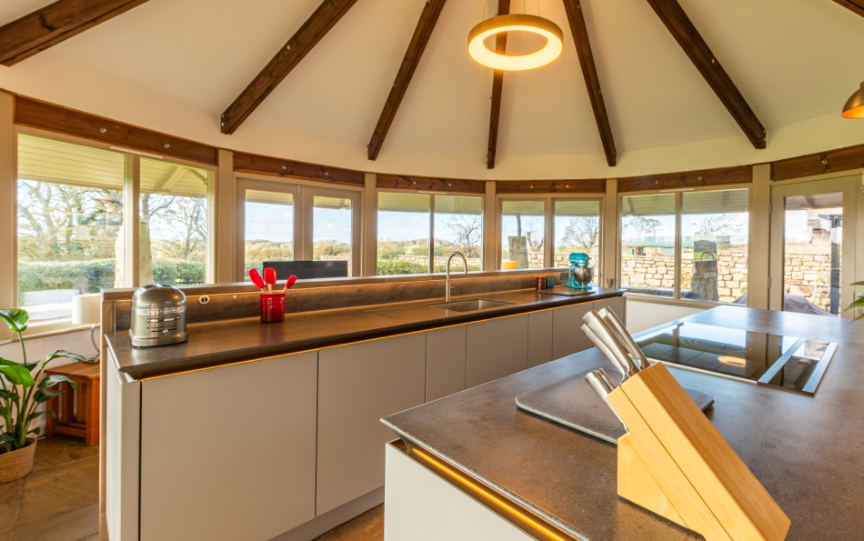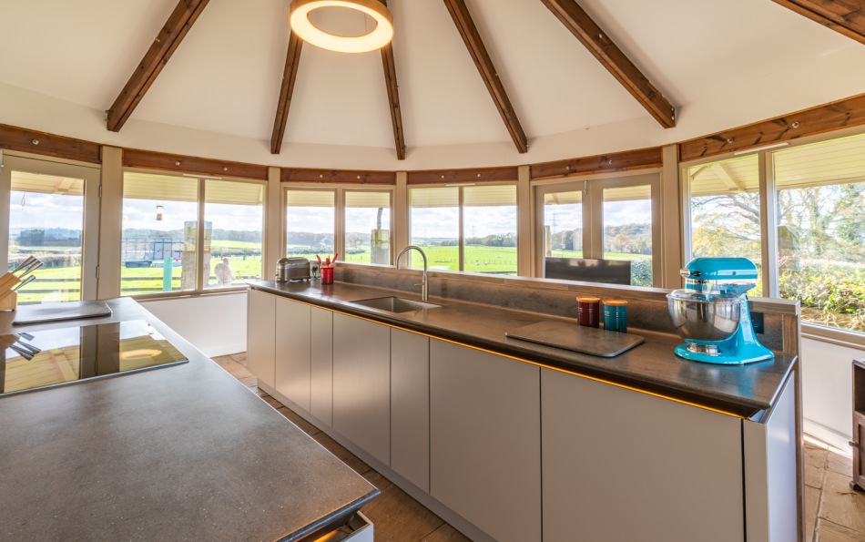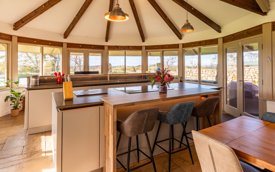 Perfectly positioned to take in sweeping countryside views, this kitchen is designed as a place to pause, gather and enjoy everyday living. The architecture naturally draws you to the centre, where a generous island sits beneath the curve of the ceiling, becoming the heart of the home.
